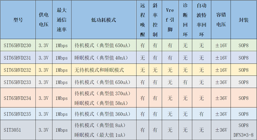 表1:芯力特3.3V CAN收发器系列芯片功能对比